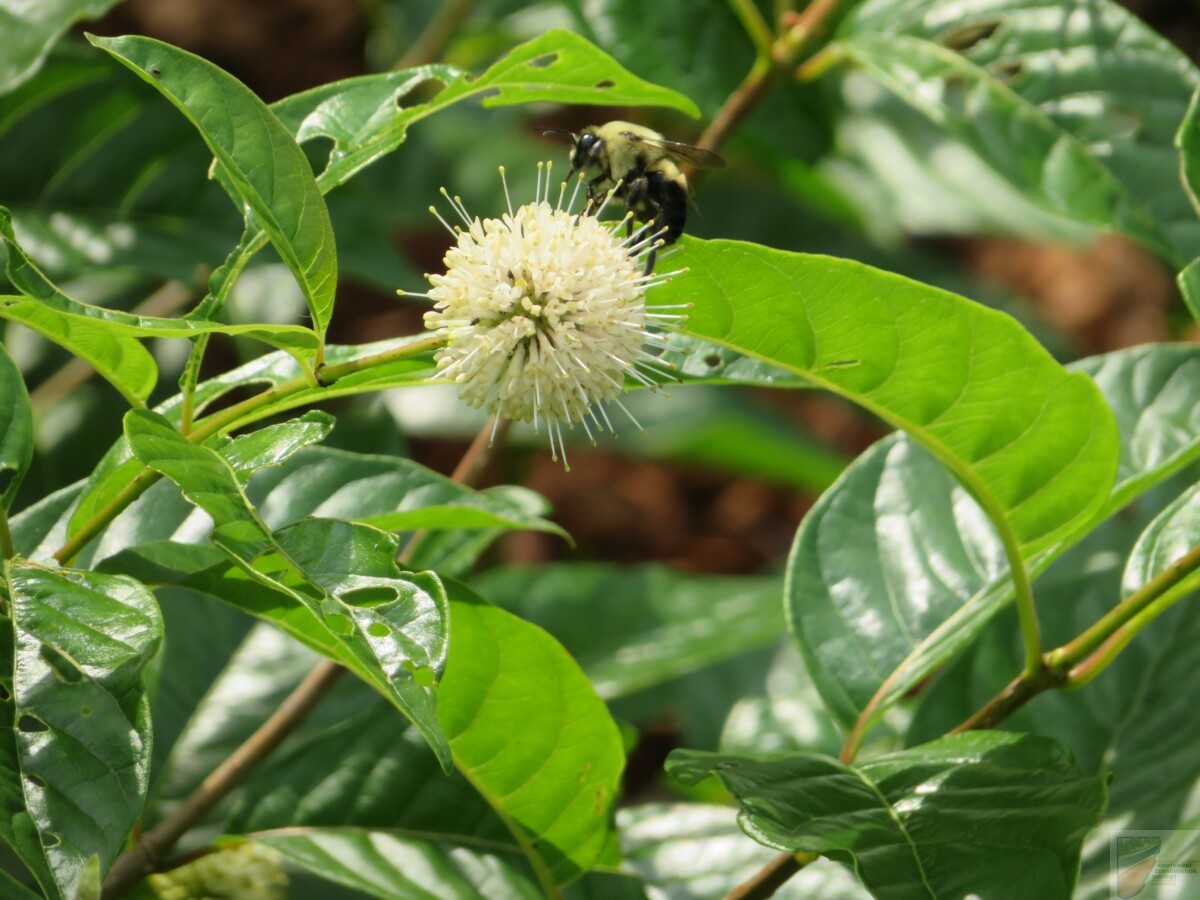 This distant relative of coffee (family Rubiaceae) grows in wetland areas. Its seeds are eaten by ducks and other waterfowl. Excellent rain garden plant that pollinators and birds love.